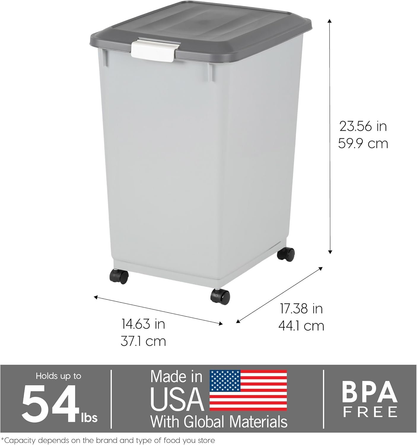 The IRIS USA Dog Food Storage Container with Wheels is a versatile and durable solution for keeping your pet's food fresh and organized. This airtight bin holds up to 54 pounds of dry food and features snap-lock latches, a built-in scoop with storage in the lid, and easy-glide wheels for hassle-free mobility. Made from BPA-free materials and FDA-compliant, it ensures safety for your pets and peace of mind for you. Choose IRIS USA for a cleaner, more convenient pet feeding experience.