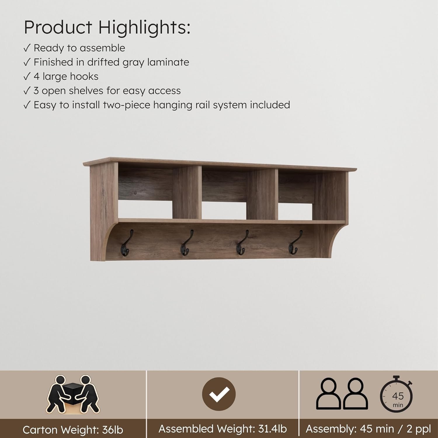 Upgrade your entryway with the Prepac Drifted Gray 48" Contemporary Wall Mounted Coat Rack, a stylish storage solution featuring three spacious shelves and sturdy coat hooks. Crafted from non-toxic, laminated composite woods with a sleek drifted gray finish, this rack combines modern design with durability. Easy to install with its two-piece hanging rail system, it maximizes both organization and space in your hallway or entryway. Ideal for enhancing any home's functionality and aesthetic appeal.